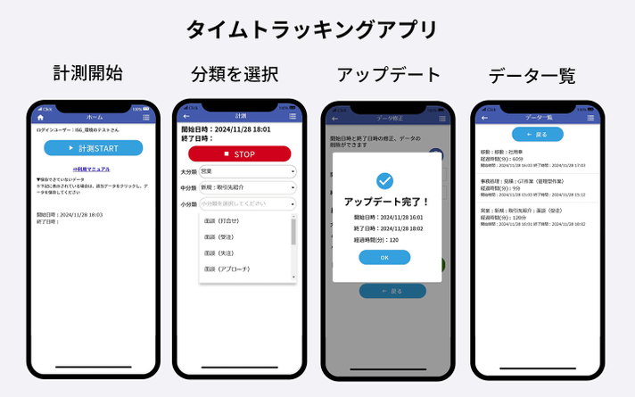 『 タイムトラッキングアプリ』社員が業務の進捗を把握し、効率的な時間管理を行うためのタイムトラッキングアプリも開発されました。このアプリは、業務工数を可視化し、効率的に工数管理を行うための重要なツールとなっています。