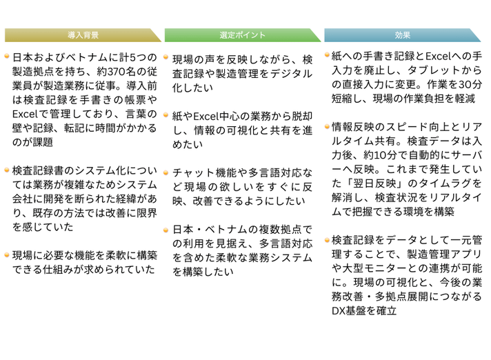 検査記録・製造管理のデジタル化により製造現場の可視化と業務標準化を実現