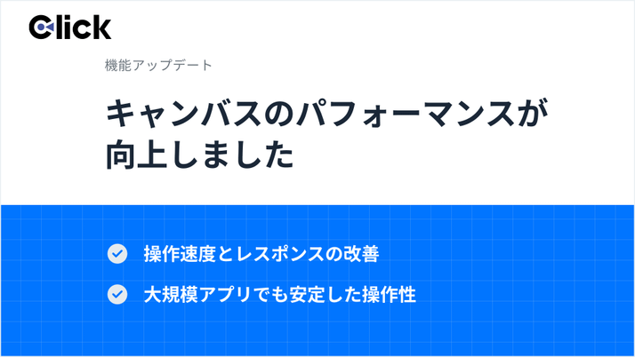 このたび、キャンバスにおけるパフォーマンス改善を実施し、より高速かつスムーズな操作が可能になりました。アプリの作成・編集時におけるレスポンスが向上し、画面移動や要素の操作もこれまで以上に快適に行えるようになりました。