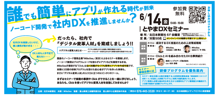 2024年6月14日、北日本新聞社様(以下、敬称略)主催で「とやまDXセミナー」が北日本新聞社6階会議室で開催されます。オンラインでの参加も可能です。参加費は無料で、対面参加は定員50名となっております。